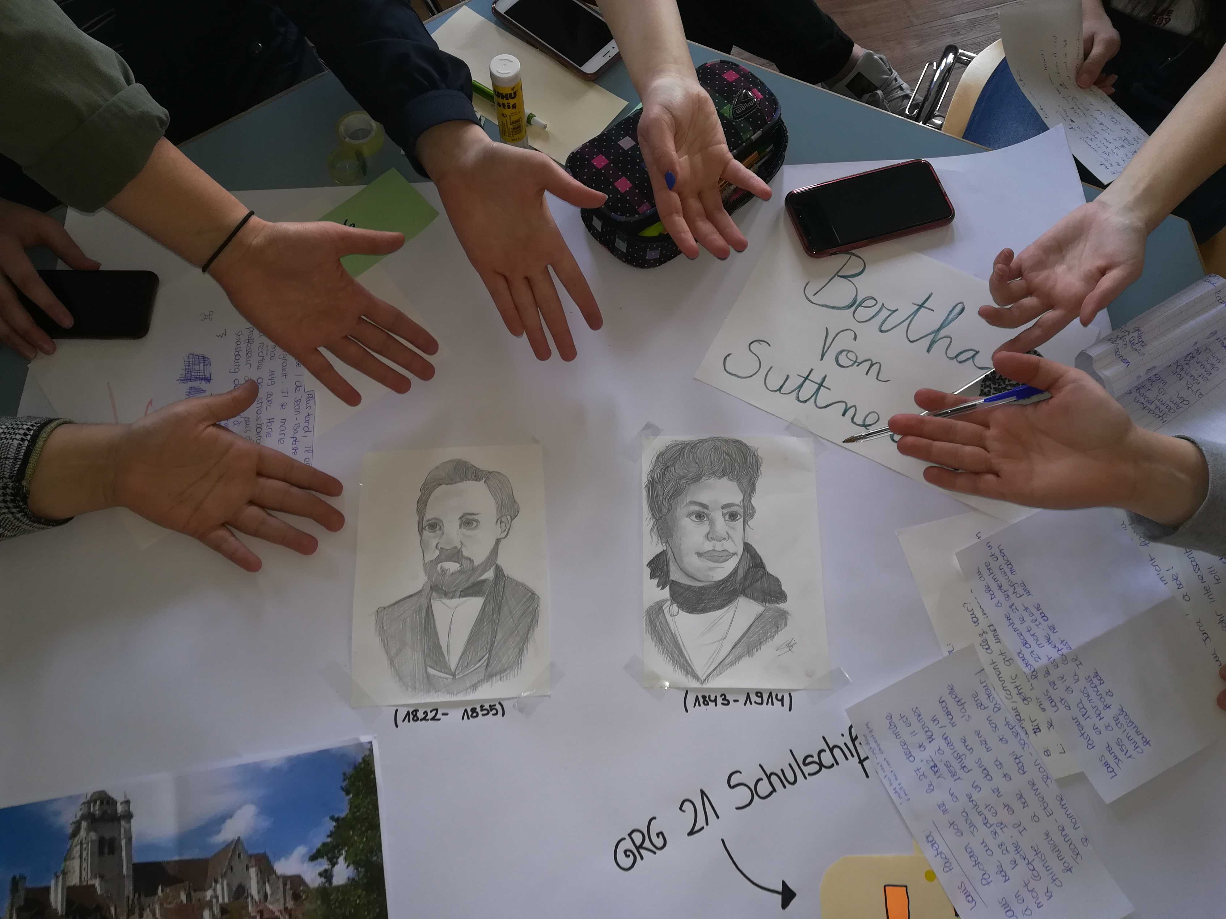 Nach den Vorträgen wurden wir in Gruppen eingeteilt, die aus jeweils vier SchülerInnen der 5A und vier aus Straßburg bestand. Das Ziel der Gruppenarbeit war ein Dialog zwischen Bertha von Suttner und Louis Pasteur, den die einzelnen Arbeitsgruppen zum Schluss präsentieren sollten. Wir mussten unseren Teil auf Französisch vortragen und die Franzosen mussten ihren Text auf Deutsch halten. Wir halfen uns gegenseitig bei der Erstellung unserer Texte in der anderen Sprache.